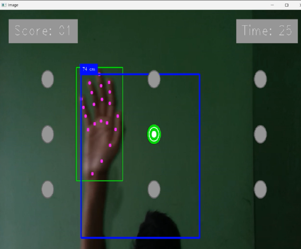 The game displays a grid of targets, where a new target appears randomly after a successful "hit." Visual feedback, including color changes and an overlay on the hand, guides the user, while a score and timer track performance. This project demonstrates practical applications of hand tracking, distance estimation using non-linear functions, and basic game logic within a computer vision framework.